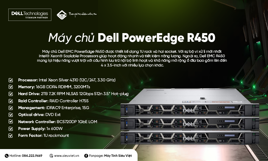 Máy chủ Dell PowerEdge R450 (RACK 1U, 8x2.5" Hotplug)/ Intel Xeon Silver 4310/ 16GB RDIMM 3200MTs/ 1.2TB 10K RPM SAS 12Gbps 512n 2.5in Hot-plug Hard Drive/ PERC H755 8GB Cache/ iDRAC9 Ent/ BC5720DP 1GbE LOM/ 600W PSU/ Bezel/ DVD Ext/ No OS/ 4 Yrs Pro