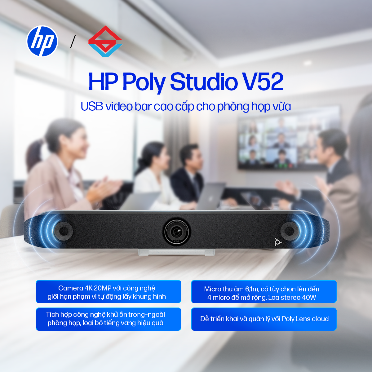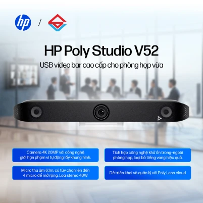 Camera hội nghị truyền hình cao cấp - Premium USB Video Bar - Poly Studio V52 dành cho các không gian phòng họp tầm trung. Ngoài diện mạo được kế thừa từ Poly Studio X52, Poly Studio V52 còn được trang bị các công nghệ âm thanh, hình ảnh hoàn toàn mới và cao cấp nhất do đội ngũ phát triển sản phẩm của HP Poly nghiên cứu dựa trên nền tảng công nghệ mang tính "di sản" của Plantronics và Polycom trước đây, kết hợp với những nhu cầu sử dụng thực tiễn đi cùng với những ứng dụng AI tiên tiến nhất.