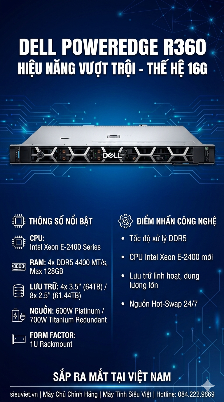 Máy Chủ Dell PowerEdge R360 thuộc dòng Dell 16G với hiệu năng vượt trội, sắp được ra mắt tại thị trường Việt Nam. Máy Chủ Chính Hãng | Máy Tính Siêu Việt sẽ cùng các bạn tìm hiểu cấu hình chi tiết của PowerEdge R360 này nhé!