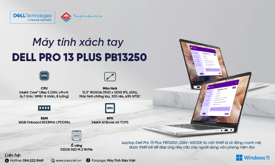 Trong kỷ nguyên của sự dịch chuyển, một chiếc laptop không chỉ cần mạnh mà phải cực kỳ gọn nhẹ. Dell Pro 13 Plus PB13250 chính là hiện thân của triết lý đó. Với sự xuất hiện của dòng chip Core Ultra Series 2 (Lunar Lake) mới nhất, đây là chiếc máy tính lý tưởng dành cho những nhà quản lý, doanh nhân và những người làm sáng tạo nội dung cần sự tinh tế nhưng không thỏa hiệp về hiệu năng.