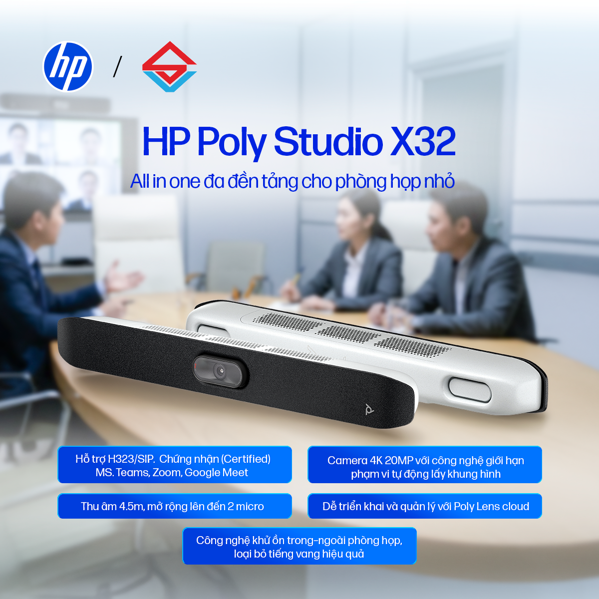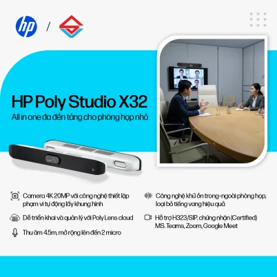 HP Poly Studio X32 là thiết bị họp trực tuyến thông minh được cải tiến thông minh có nhiều tiện ích nổi bật với tính năng chia sẻ dữ liệu không dây cùng camera tracking theo giọng nói, tương thích các nền tảng native Zoom, Teams, Google...và giao thức truyền thống H.323/SIP.