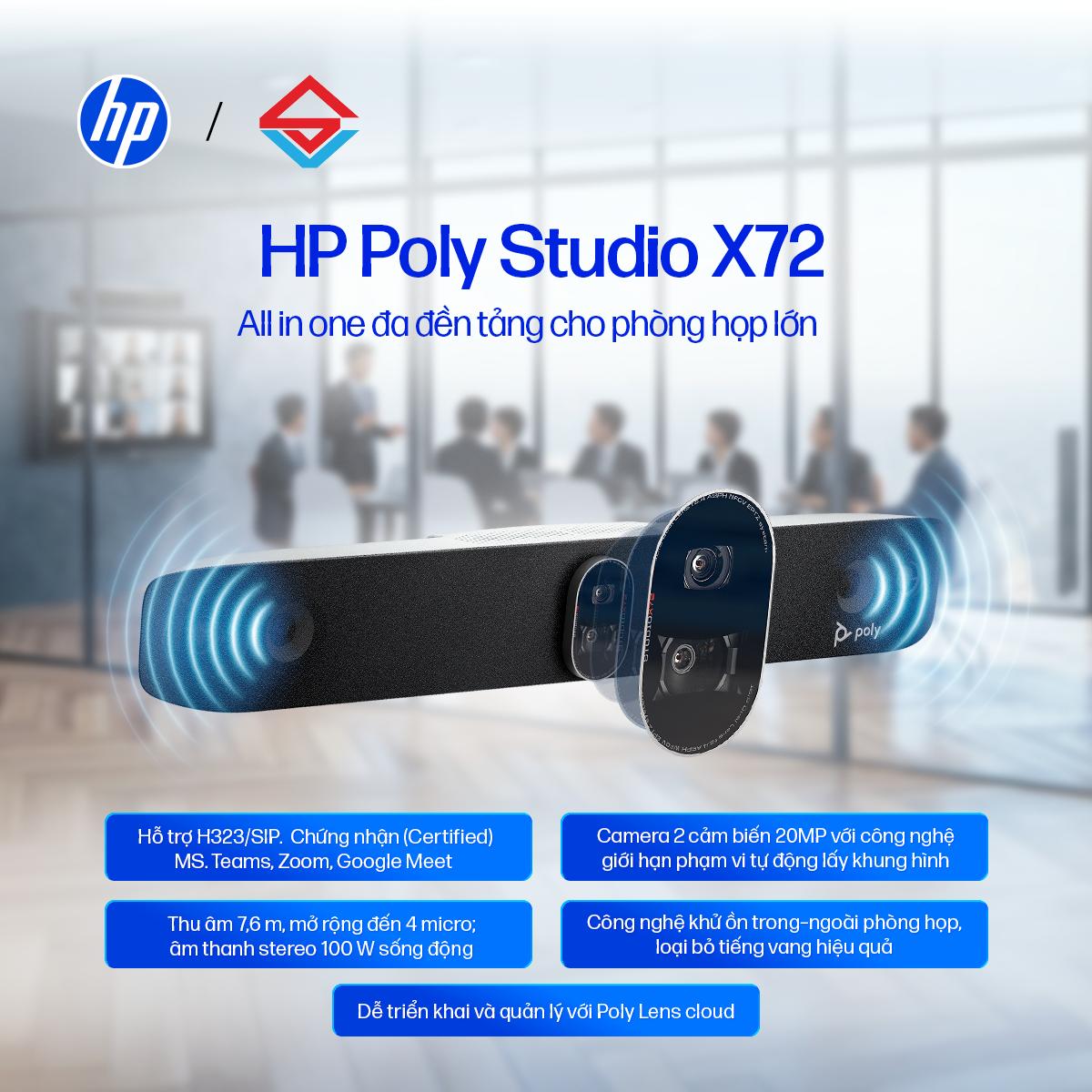 Trang bị cho các phòng hội nghị lớn với thiết bị hội nghị truyền hình HP Poly Studio X72, tự hào với công nghệ âm thanh và hình ảnh tiên tiến, khả năng mở rộng và tính linh hoạt để tham gia hầu hết mọi cuộc gọi video trên nhiều nền tảng khác nhau.